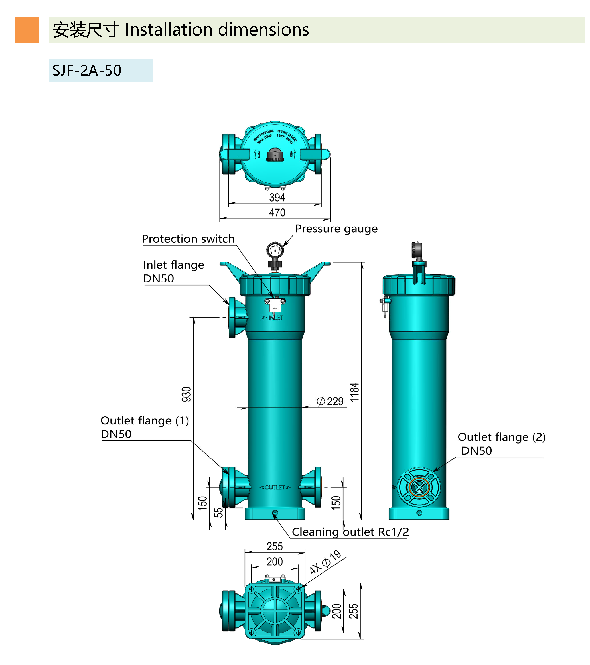 ●.进出水口采用法兰式连接,坚固耐用,可配各国标准管道法兰使用。